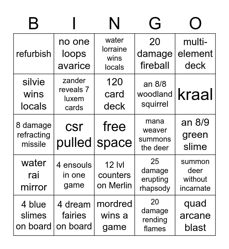This bingo card has a free space and 24 words: 4 blue slimes on board, 4 ensouls in one game, 120 card deck, 20 damage rending flames, multi-element deck, refurbish, no one loops avarice, water lorraine wins locals, mana weaver summons the deer, an 8/9 green slime, 8 damage refracting missile, zander reveals 7 luxem cards, 25 damage erupting rhapsody, summon deer without incarnate, silvie wins locals, 4 dream fairies on board, mordred wins a game, 20 damage fireball, kraal, water rai mirror, csr pulled, 12 lvl counters on Merlin, an 8/8 woodland squirrel and quad arcane blast.