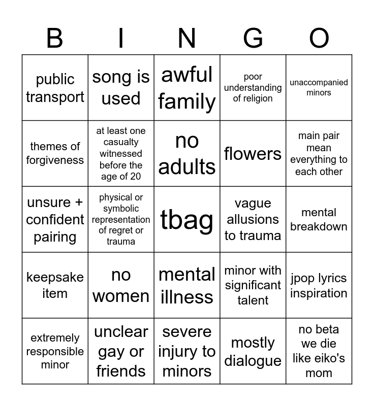 This bingo card has a free space and 24 words: no women, unclear gay or friends, no adults, extremely responsible minor, unaccompanied minors, public transport, themes of forgiveness, song is used, vague allusions to trauma, mental illness, flowers, unsure + confident pairing, minor with significant talent, jpop lyrics inspiration, at least one casualty witnessed before the age of 20, mostly dialogue, mental breakdown, awful family, main pair mean everything to each other, physical or symbolic representation of regret or trauma, no beta we die like eiko's mom, keepsake item, poor understanding of religion and severe injury to minors.