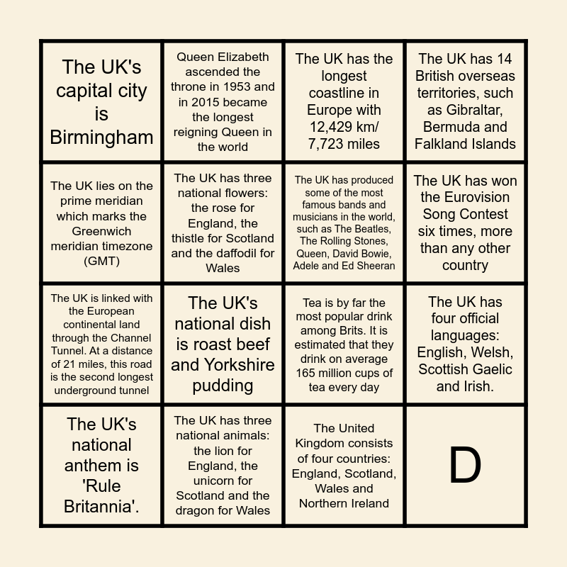This bingo card has 17 words: The United Kingdom consists of four countries: England, Scotland, Wales and Northern Ireland, The UK's national anthem is 'Rule Britannia'., The UK has the longest coastline in Europe with 12,429 km/ 7,723 miles, The UK's capital city is Birmingham, The UK's national dish is roast beef and Yorkshire pudding, The UK has 14 British overseas territories, such as Gibraltar, Bermuda and Falkland Islands, The UK has four official languages: English, Welsh, Scottish Gaelic and Irish., The UK has produced some of the most famous bands and musicians in the world, such as The Beatles, The Rolling Stones, Queen, David Bowie, Adele and Ed Sheeran, The UK has won the Eurovision Song Contest six times, more than any other country, The UK has three national flowers: the rose for England, the thistle for Scotland and the daffodil for Wales, The UK has three national animals: the lion for England, the unicorn for Scotland and the dragon for Wales, Tea is by far the most popular drink among Brits. It is estimated that they drink on average 165 million cups of tea every day, The UK lies on the prime meridian which marks the Greenwich meridian timezone (GMT), Queen Elizabeth ascended the throne in 1953 and in 2015 became the longest reigning Queen in the world, The UK is linked with the European continental land through the Channel Tunnel. At a distance of 21 miles, this road is the second longest underground tunnel, Fish and chips were invented in France and brought to England by Jewish immigrants in the 17th century and D.