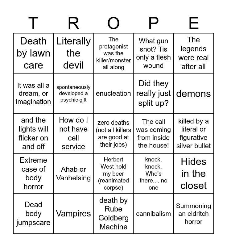 This bingo card has 55 words: Virgin Final Girl, Dead body jumpscare, Death by sporting goods, Death by lawn care, death by Rube Goldberg Machine, Foreshadowing, spontaneously developed a psychic gift, Did they really just go into the basement?, Did they really just split up?, Cut the music que the jumpscare!, What gun shot? Tis only a flesh wound, What stabbing? Tis only a flesh wound, Possessed Doll, Oblivious bystander gag, References to real life serial killers, Found Footage, The legends were real after all, How do I not have cell service, the hoe dies first, zero deaths (not all killers are good at their jobs), The call was coming from inside the house!, Ring, Ring... Who's there... an asthmatic., knock, knock. Who's there.... no one, The protagonist was the killer/monster all along, Vengeance is a dish served with gratuitous overkill., enucleation, cannibalism, one man's body part is another's home decor, killed by a literal or figurative silver bullet, Hides in the closet, killer plays redlight green light, killer gets knocked down, then gets up again, aint nothing gonna keep him down, Eww, It got in my mouth, why didn't you grab the (insert obvious weapon here), It was all a dream, or imagination, and the lights will flicker on and off, off screen death, Extreme case of body horror, Summoning an eldritch horror, Hellish Crab walking, Literally the devil, Causes their own death, death by stupid accident, wonderful day for an exorcism, Ahab or Vanhelsing, Vampires, Zombies, Werewolves, ghosts, demons, A cult is like a family, but with cool hoodies, Anthology within a framework narrative, Anthology where the stories all tie together, Herbert West hold my beer (reanimated corpse) and Weird Science.