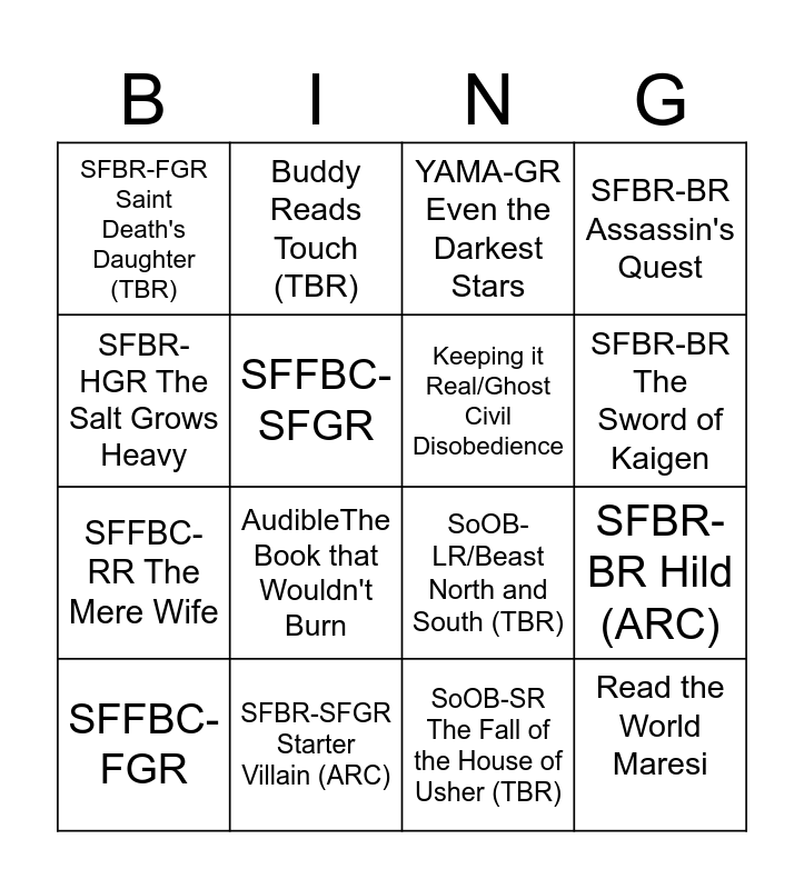 This bingo card has 16 words: SFBR-SFGR Starter Villain (ARC), SFBR-BR Hild (ARC), YAMA-GR Even the Darkest Stars, SFBR-FGR Saint Death's Daughter (TBR), SFFBC-RR The Mere Wife, Buddy Reads Touch (TBR), SoOB-LR/Beast North and South (TBR), SoOB-SR The Fall of the House of Usher (TBR), SFBR-HGR The Salt Grows Heavy, SFFBC-SFGR, SFFBC-FGR, SFBR-BR Assassin's Quest, AudibleThe Book that Wouldn't Burn, SFBR-BR The Sword of Kaigen, Keeping it Real/Ghost Civil Disobedience and Read the World Maresi.