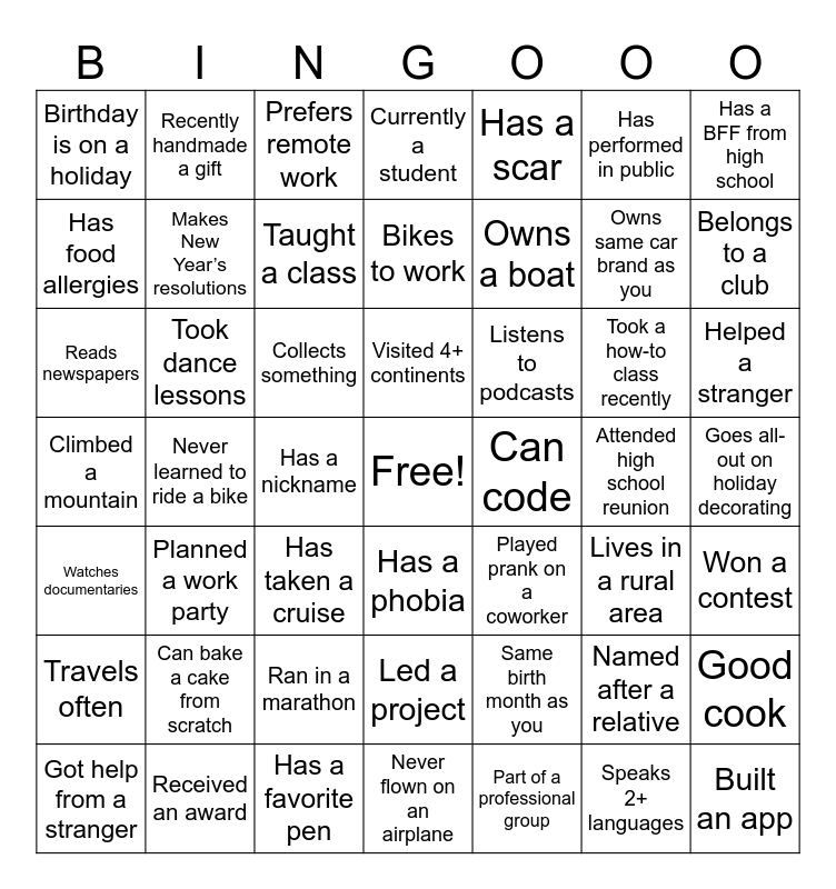 This bingo card has a free space and 48 words: Same birth month as you, Owns same car brand as you, Never flown on an airplane, Never learned to ride a bike, Collects something, Goes all-out on holiday decorating, Recently handmade a gift, Received an award, Has performed in public, Has a phobia, Has a BFF from high school, Currently a student, Took a how-to class recently, Listens to podcasts, Travels often, Attended high school reunion, Has food allergies, Belongs to a club, Named after a relative, Has a scar, Owns a boat, Has a nickname, Birthday is on a holiday, Makes New Year’s resolutions, Good cook, Taught a class, Helped a stranger, Got help from a stranger, Visited 4+ continents, Took dance lessons, Speaks 2+ languages, Can code, Won a contest, Can bake a cake from scratch, Climbed a mountain, Played prank on a coworker, Lives in a rural area, Reads newspapers, Has taken a cruise, Ran in a marathon, Watches documentaries, Built an app, Prefers remote work, Has a favorite pen, Bikes to work, Led a project, Planned a work party and Part of a professional group.