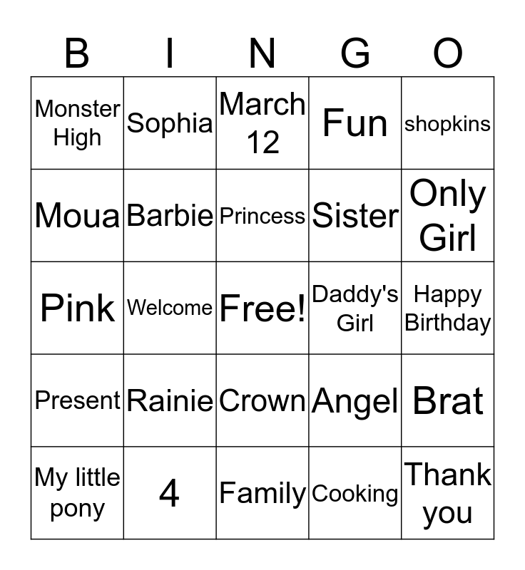 This bingo card has a free space and 24 words: Rainie, 4, Princess, My little pony, shopkins, Monster High, Moua, Sophia, Daddy's Girl, Crown, Sister, Pink, Angel, Brat, Barbie, Cooking, Happy Birthday, March 12, Only Girl, Welcome, Thank you, Present, Fun and Family.