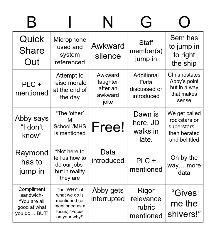 This bingo card has a free space and 24 words: “Not here to tell us how to do our jobs” but in reality they are, The ‘WHY’ of what we do is mentioned (or mentioned as a focus) “Focus on your why!”, Awkward laughter after an awkward joke, Compliment sandwich- “You are all good at what you do….BUT”, Sem has to jump in to right the ship, Quick Share Out, PLC + mentioned, Microphone used and system referenced, Dawn is here, JD walks in late., Data introduced, Additional Data discussed or introduced, Abby says “I don’t know”, PLC + mentioned, Oh by the way….more data, Attempt to raise morale at the end of the day, Rigor relevance rubric mentioned, We get called rockstars or superstars…then berated and belittled, Awkward silence, Chris restates Abby’s point but in a way that makes sense, “The ‘other’ M School”/MHS is mentioned, “Gives me the shivers!”, Raymond has to jump in, Staff member(s) jump in and Abby gets interrupted.
