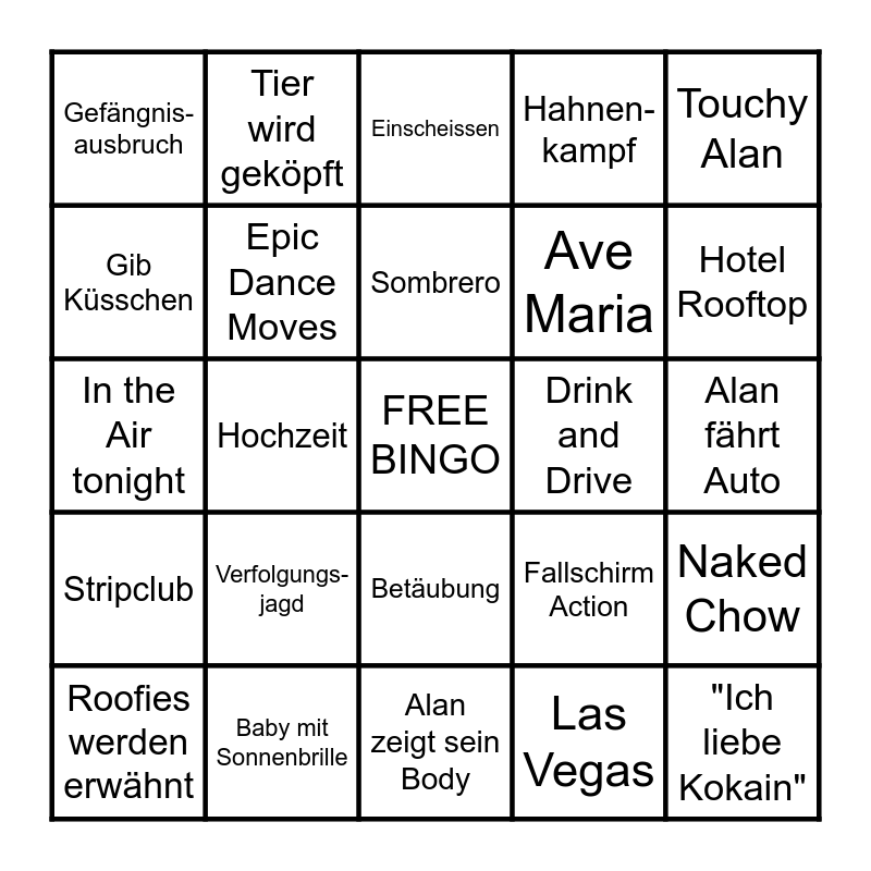 This bingo card has a free space and 24 words: Verfolgungs-jagd, Baby mit Sonnenbrille, Sombrero, Roofies werden erwähnt, Touchy Alan, Gefängnis-ausbruch, Gib Küsschen, Tier wird geköpft, Drink and Drive, Betäubung, Ave Maria, In the Air tonight, Fallschirm Action, Naked Chow, Epic Dance Moves, Las Vegas, Alan fährt Auto, Einscheissen, Hotel Rooftop, Hochzeit, "Ich liebe Kokain", Stripclub, Hahnen-kampf and Alan zeigt sein Body.