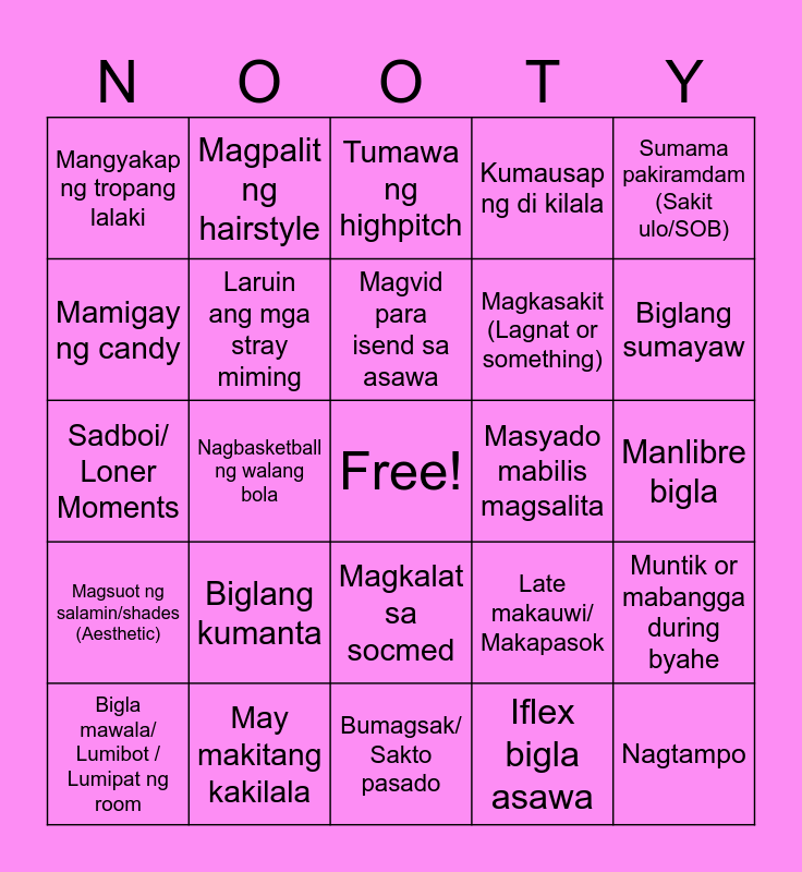 This bingo card has a free space and 29 words: Umiyak, May makitang kakilala, Tumawa ng highpitch, May maiwan/ Mawalang gamit, Sumama pakiramdam (Sakit ulo/SOB), Mangyakap ng tropang lalaki, Laruin ang mga stray miming, Magvid para isend sa asawa, Masyado mabilis magsalita, Muntik or mabangga during byahe, Bigla mawala/ Lumibot / Lumipat ng room, Nagbasketball ng walang bola, Iflex bigla asawa, Nagtampo, Sadboi/ Loner Moments, Manakot, Bumagsak/ Sakto pasado, Late makauwi/ Makapasok, Biglang sumayaw, Magsuot ng salamin/shades (Aesthetic), Biglang kumanta, Magsuggest/ Magsabi ng random thoughts, Magkasakit (Lagnat or something), Manlibre bigla, Mamigay ng candy, Magpalit ng hairstyle, Magkalat sa socmed, Kumausap ng di kilala and Mambash/ Mantrip.