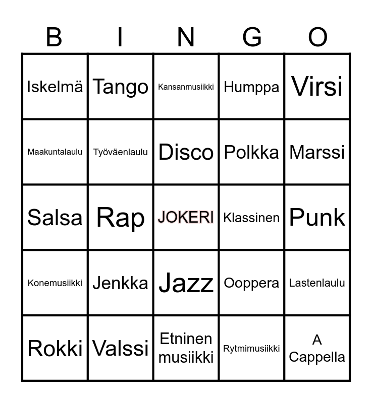 This bingo card has a free space and 24 words: Jenkka, Valssi, Disco, Rokki, Virsi, Iskelmä, Maakuntalaulu, Tango, Klassinen, Jazz, Polkka, Salsa, Ooppera, Lastenlaulu, Työväenlaulu, Rytmimusiikki, Punk, Kansanmusiikki, Marssi, Rap, A Cappella, Konemusiikki, Humppa and Etninen musiikki.