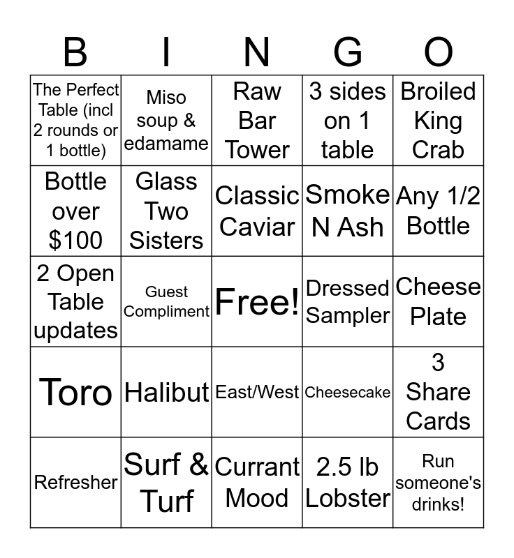 This bingo card has a free space and 24 words: Halibut, Surf & Turf, Classic Caviar, Refresher, Broiled King Crab, The Perfect Table (incl 2 rounds or 1 bottle), Bottle over $100, Miso soup & edamame, Dressed Sampler, East/West, Smoke N Ash, 2 Open Table updates, Cheesecake, 3 Share Cards, Glass Two Sisters, 2.5 lb Lobster, Cheese Plate, Raw Bar Tower, Any 1/2 Bottle, Guest Compliment, Run someone's drinks!, Toro, 3 sides on 1 table and Currant Mood.