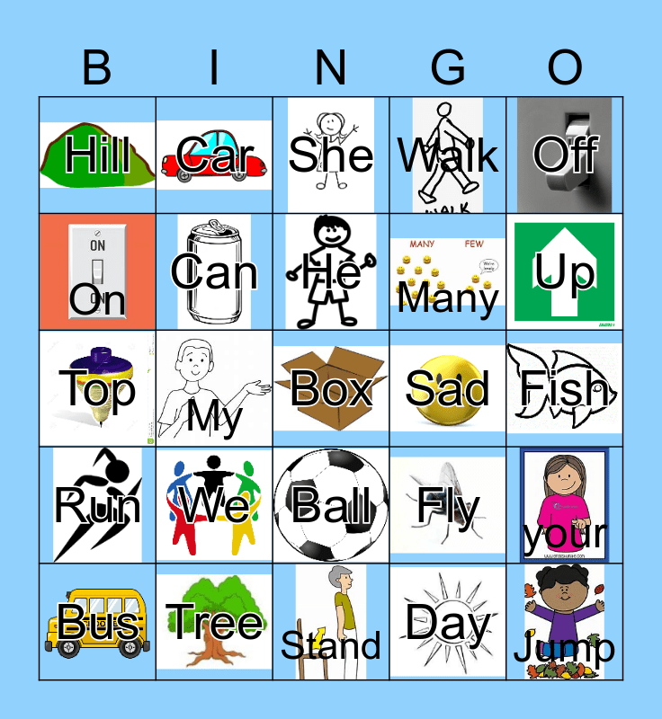 This bingo card has 34 images, a free space and 34 words: See, Day, Night, Down, Run, Can, Off, Bus, Car, Go, He, She, Sit, Hop, Sad, Up, Tree, Top, We, Fly, Ball, Fox, Hill, Fish, Stand, Jump, Walk, Cut, Many, On, No, My, your and One.