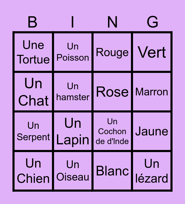 This bingo card has 20 words: Jaune, Bleu, Rouge, Las Animaux de Compagnie, Un Chien, Un Chat, Un Oiseau, Une Tortue, Un Serpent, Un Poisson, Un Lapin, Un Cochon de d'lnde, Un hamster, Un lézard, Rose, Noir, Marron, Vert, Blanc and Orange.