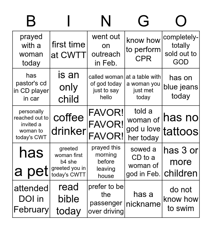This bingo card has a free space and 24 words: greeted woman first b4 she greeted you in today's CWTT, read bible today, called woman of god today just to say hello, attended DOI in February, completely-totally sold out to GOD, prayed with a woman today, has pastor's cd in CD player in car, first time at CWTT, told a woman of god u love her today, prayed this morning before leaving house, at a table with a woman you just met today, personally reached out to invited a woman to today's CWT, sowed a CD to a woman of god in Feb., has 3 or more children, is an only child, has a nickname, has no tattoos, went out on outreach in Feb., has on blue jeans today, coffee drinker, do not know how to swim, has a pet, know how to perform CPR and prefer to be the passenger over driving.