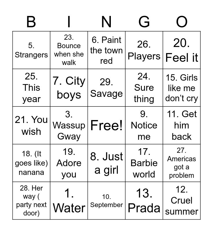 This bingo card has a free space and 30 words: 1. Water, 2. Dance the night, 3. Wassup Gway, 4. Greedy, 5. Strangers, 6. Paint the town red, 7. City boys, 8. Just a girl, 9. Notice me, 10. September, 11. Get him back, 12. Cruel summer, 13. Prada, 14. Fukumean, 15. Girls like me don’t cry, 16. Lil boo thang, 17. Barbie world, 18. (It goes like) nanana, 19. Adore you, 20. Feel it, 21. You wish, 22. Come on time, 23. Bounce when she walk, 24. Sure thing, 25. This year, 26. Players, 27. Americas got a problem, 28. Her way ( party next door), 29. Savage and 30. Cake.