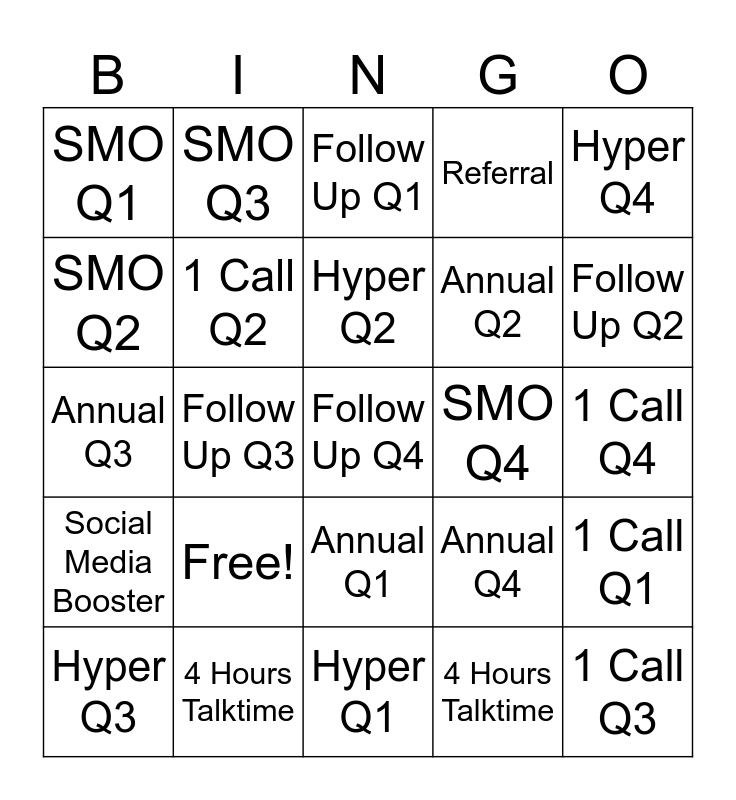 This bingo card has 25 words: Free!, Hyper Q1, Hyper Q2, Hyper Q3, Hyper Q4, SMO Q1, SMO Q2, SMO Q3, SMO Q4, Annual Q1, Annual Q2, Annual Q3, Annual Q4, 1 Call Q1, 1 Call Q2, 1 Call Q3, 1 Call Q4, Follow Up Q1, Follow Up Q2, Follow Up Q3, Follow Up Q4, 4 Hours Talktime, Social Media Booster, Referral and 4 Hours Talktime.