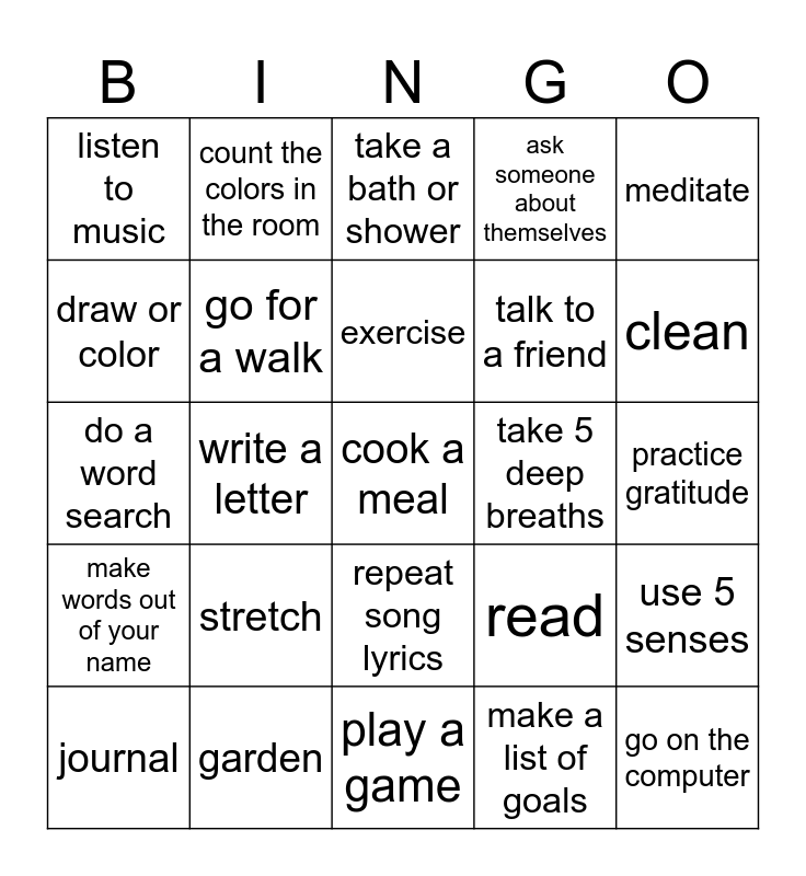 This bingo card has 25 words: stretch, play a game, exercise, journal, meditate, listen to music, draw or color, count the colors in the room, take 5 deep breaths, repeat song lyrics, talk to a friend, do a word search, read, use 5 senses, go for a walk, go on the computer, practice gratitude, take a bath or shower, clean, write a letter, cook a meal, garden, make words out of your name, ask someone about themselves and make a list of goals.