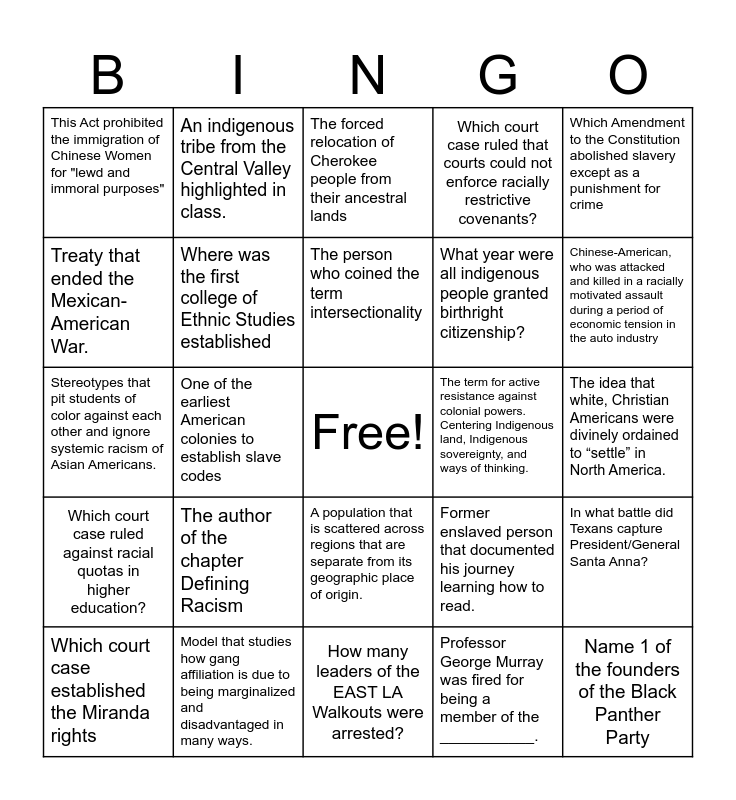 This bingo card has a free space and 24 words: The author of the chapter Defining Racism, Model that studies how gang affiliation is due to being marginalized and disadvantaged in many ways., The person who coined the term intersectionality, Which court case established the Miranda rights, Which Amendment to the Constitution abolished slavery except as a punishment for crime, This Act prohibited the immigration of Chinese Women for "lewd and immoral purposes", Treaty that ended the Mexican-American War., An indigenous tribe from the Central Valley highlighted in class., The term for active resistance against colonial powers. Centering Indigenous land, Indigenous sovereignty, and ways of thinking., A population that is scattered across regions that are separate from its geographic place of origin., What year were all indigenous people granted birthright citizenship?, Stereotypes that pit students of color against each other and ignore systemic racism of Asian Americans., Former enslaved person that documented his journey learning how to read., In what battle did Texans capture President/General Santa Anna?, Where was the first college of Ethnic Studies established, Professor George Murray was fired for being a member of the ___________., The idea that white, Christian Americans were divinely ordained to “settle” in North America., The forced relocation of Cherokee people from their ancestral lands, Chinese-American, who was attacked and killed in a racially motivated assault during a period of economic tension in the auto industry, One of the earliest American colonies to establish slave codes, Name 1 of the founders of the Black Panther Party, Which court case ruled against racial quotas in higher education?, Which court case ruled that courts could not enforce racially restrictive covenants? and How many leaders of the EAST LA Walkouts were arrested?.