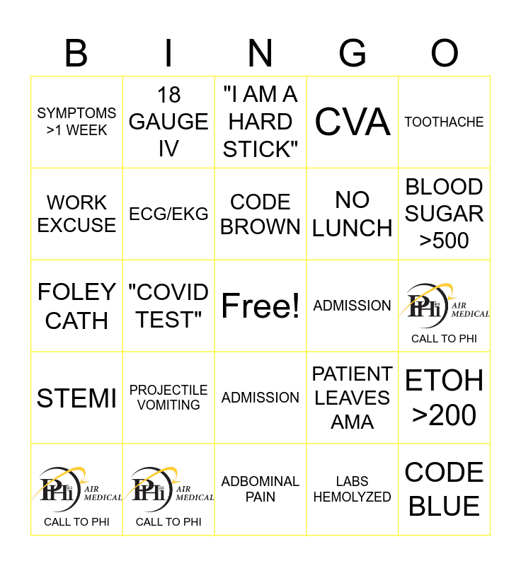 This bingo card has 3 images, a free space and 24 words: CALL TO PHI, PROJECTILE VOMITING, CODE BROWN, LABS HEMOLYZED, TOOTHACHE, SYMPTOMS >1 WEEK, 18 GAUGE IV, "I AM A HARD STICK", ADMISSION, CALL TO PHI, FOLEY CATH, ECG/EKG, PATIENT LEAVES AMA, ETOH >200, WORK EXCUSE, CALL TO PHI, ADBOMINAL PAIN, CVA, BLOOD SUGAR >500, STEMI, "COVID TEST", ADMISSION, NO LUNCH and CODE BLUE.
