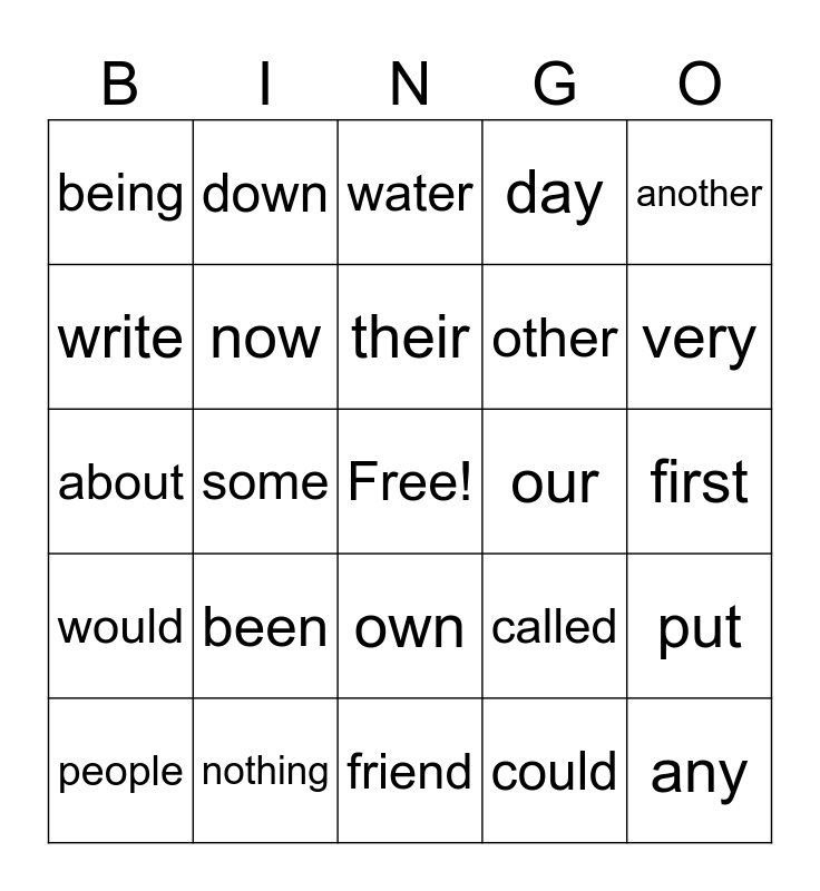 This bingo card has a free space and 24 words: been, nothing, their, people, another, being, write, down, our, own, other, about, called, put, now, could, first, water, very, some, any, would, day and friend.