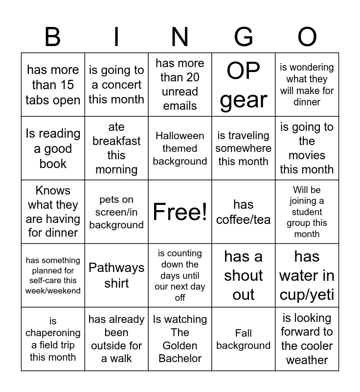 This bingo card has a free space and 24 words: Pathways shirt, has already been outside for a walk, Halloween themed background, is chaperoning a field trip this month, is wondering what they will make for dinner, has more than 15 tabs open, Is reading a good book, is going to a concert this month, has coffee/tea, is counting down the days until our next day off, is traveling somewhere this month, Knows what they are having for dinner, has a shout out, has water in cup/yeti, ate breakfast this morning, Fall background, Will be joining a student group this month, has more than 20 unread emails, is going to the movies this month, pets on screen/in background, is looking forward to the cooler weather, has something planned for self-care this week/weekend, OP gear and Is watching The Golden Bachelor.
