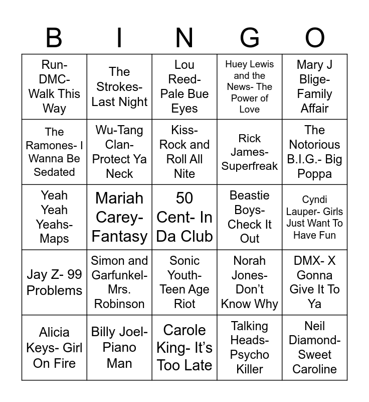 This bingo card has 28 words: DMX- X Gonna Give It To Ya, Goo Goo Dolls- Name, Rick James- Superfreak, Talking Heads- Psycho Killer, The Ramones- I Wanna Be Sedated, Lou Reed- Pale Bue Eyes, The Strokes- Last Night, Jay Z- 99 Problems, Beastie Boys- Check It Out, Alicia Keys- Girl On Fire, Yeah Yeah Yeahs- Maps, Huey Lewis and the News- The Power of Love, Billy Joel- Piano Man, Carole King- It’s Too Late, The Notorious B.I.G.- Big Poppa, Lady Gaga- Bad Romance, Simon and Garfunkel- Mrs. Robinson, Wu-Tang Clan- Protect Ya Neck, Kiss- Rock and Roll All Nite, Sonic Youth- Teen Age Riot, Run-DMC- Walk This Way, Neil Diamond- Sweet Caroline, 50 Cent- In Da Club, Mariah Carey- Fantasy, Cyndi Lauper- Girls Just Want To Have Fun, Norah Jones- Don’t Know Why, Mary J Blige- Family Affair and Nicki Minaj- Super Bass.