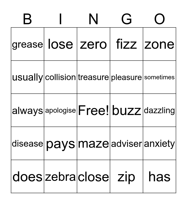 This bingo card has a free space and 45 words: his, has, was, does, goes, zip, zero, zest, zone, zebra, fizz, buzz, maze, pays, these, close, closing, always, because, sometimes, lose, enclose, desert, grease, freeze, dazzling, excuse, cause, adviser, disease, position, anxiety, scissors, desirable, organise, apologise, exercise, sausages, applause, treasure, usually, pleasure, leisure, collision and massage.
