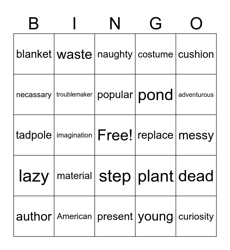 This bingo card has a free space and 24 words: material, American, popular, author, cushion, blanket, necassary, waste, replace, step, pond, tadpole, plant, dead, troublemaker, young, messy, naughty, adventurous, imagination, curiosity, lazy, costume and present.