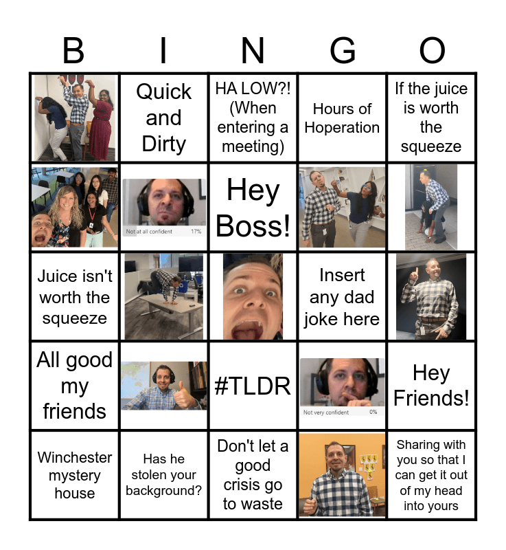 This bingo card has 10 images, a free space and 14 words: Winchester mystery house, Hey Boss!, If the juice is worth the squeeze, Quick and Dirty, HA LOW?! (When entering a meeting), Insert any dad joke here, Juice isn't worth the squeeze, Hey Friends!, Has he stolen your background?, Don't let a good crisis go to waste, Hours of Hoperation, All good my friends, #TLDR and Sharing with you so that I can get it out of my head into yours.
