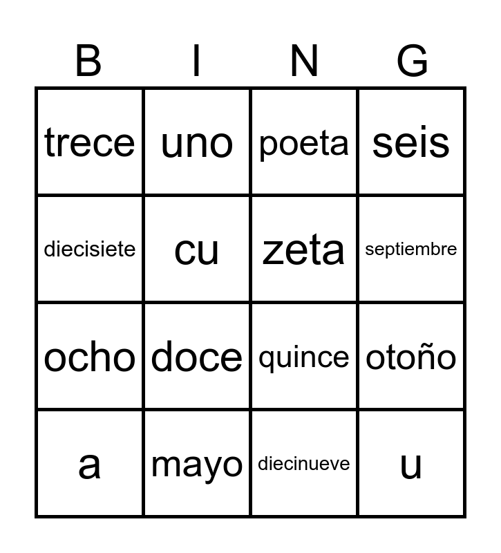 This bingo card has 71 words: Free!, uno, dos, tres, cuatro, cinco, seis, siete, ocho, nueve, diez, once, doce, trece, catorce, quince, deiciséis, diecisiete, dieciocho, diecinueve, veinte, a, be, ce, de, e, efe, ge, hache, i, jota, ka, ele, eme, ene, eñe, o, pe, cu, ere, ese, te, u, uve, uve doble, equis, i griega, zeta, enero, febrero, marzo, abril, mayo, junio, julio, agosto, septiembre, octubre, noviembre, diciembre, primavera, verano, otoño, invierno, Pablo Neruda, Chile, poeta, poema, Mafalda, Argentina and caricatura.