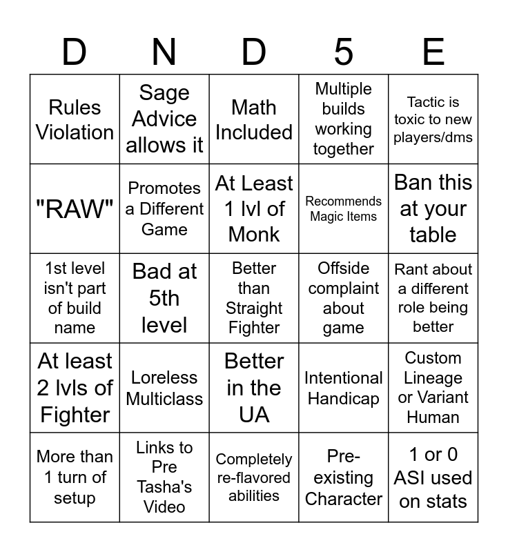 This bingo card has a free space and 24 words: Loreless Multiclass, Links to Pre Tasha's Video, At Least 1 lvl of Monk, More than 1 turn of setup, Tactic is toxic to new players/dms, Rules Violation, "RAW", Sage Advice allows it, Offside complaint about game, Better in the UA, Recommends Magic Items, 1st level isn't part of build name, Intentional Handicap, Custom Lineage or Variant Human, Promotes a Different Game, Pre-existing Character, Rant about a different role being better, Math Included, Ban this at your table, Bad at 5th level, 1 or 0 ASI used on stats, At least 2 lvls of Fighter, Multiple builds working together and Completely re-flavored abilities.