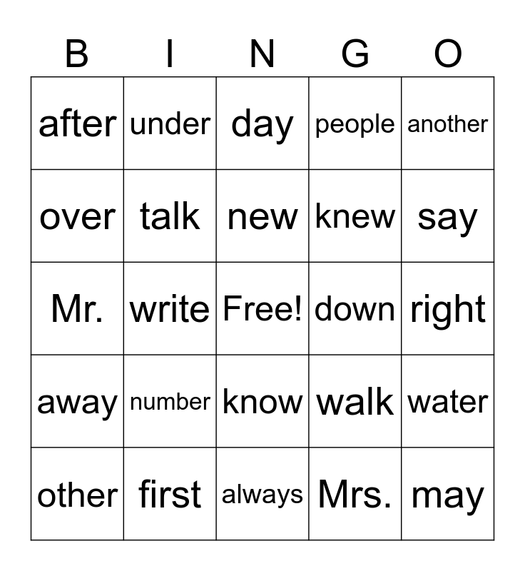 This bingo card has a free space and 24 words: number, first, new, other, another, after, over, under, down, know, knew, Mr., walk, water, talk, Mrs., right, day, say, write, may, away, people and always.