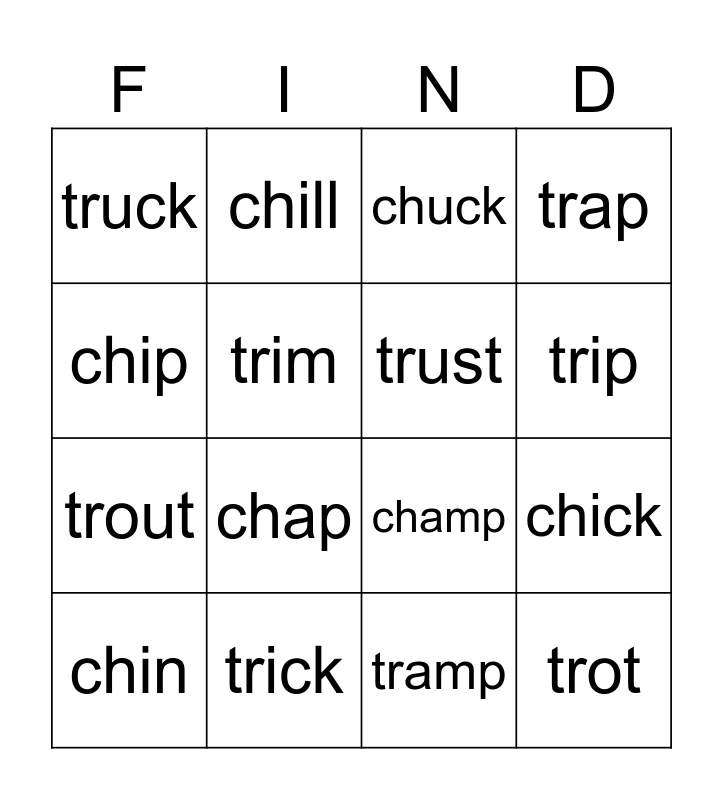 This bingo card has 16 words: trick, chick, chuck, truck, trout, chill, champ, tramp, chip, trim, chin, trap, chap, trip, trust and trot.
