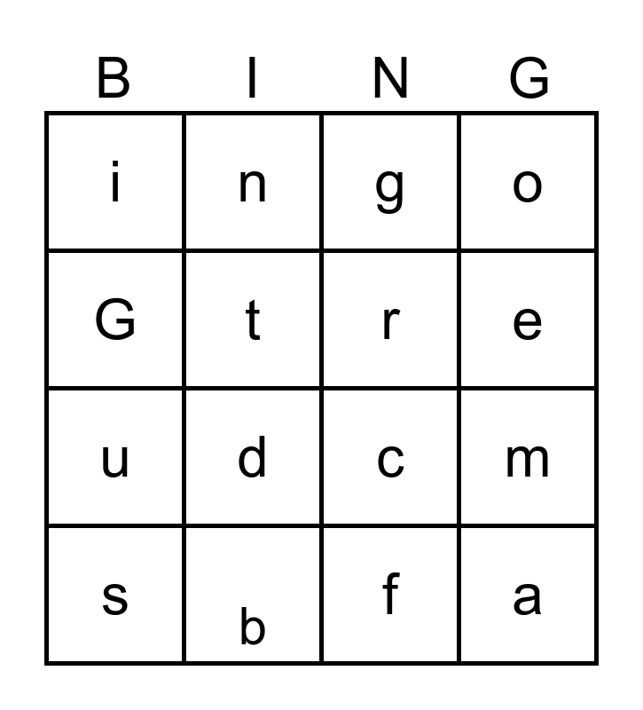 This bingo card has 16 words: b, m, g, i, u, n, c, f, G, t, s, o, d, e, r and a.