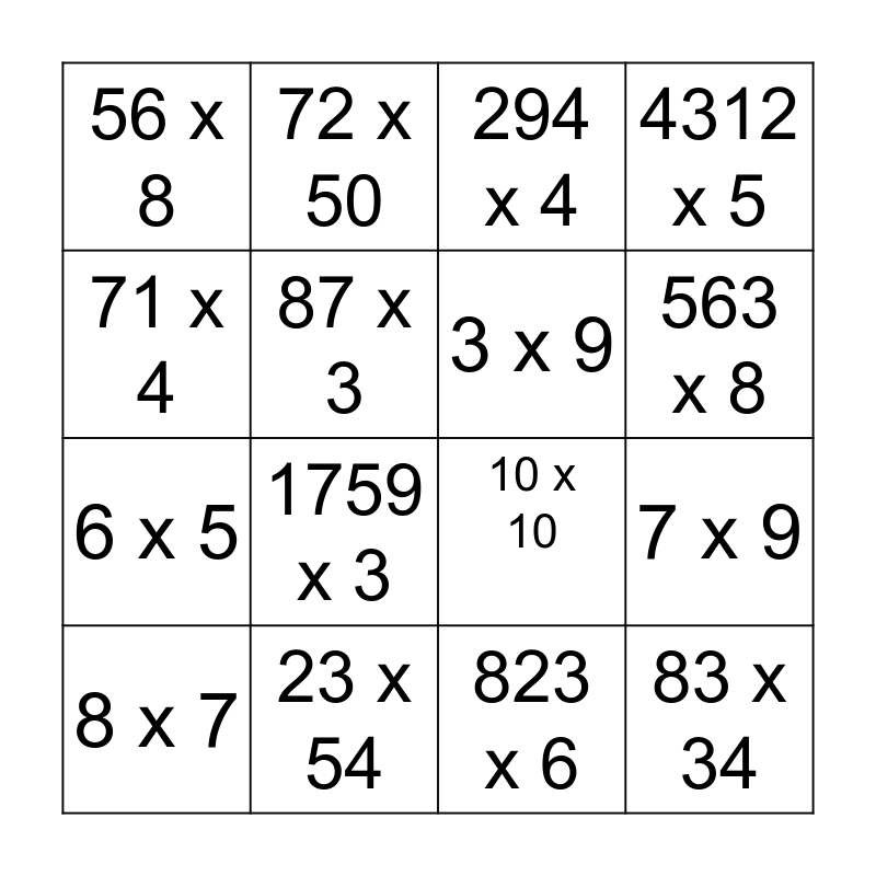 This bingo card has 16 words: 23 x 54, 7 x 9, 294 x 4, 56 x 8, 6 x 5, 72 x 50, 10 x 10, 823 x 6, 71 x 4, 87 x 3, 8 x 7, 4312 x 5, 1759 x 3, 563 x 8, 3 x 9 and 83 x 34.