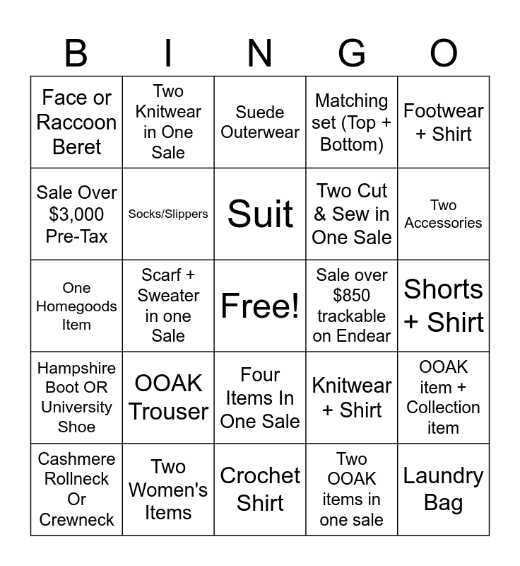 This bingo card has a free space and 24 words: OOAK Trouser, Two Women's Items, Suit, Cashmere Rollneck Or Crewneck, Footwear + Shirt, Face or Raccoon Beret, Sale Over $3,000 Pre-Tax, Two Knitwear in One Sale, Sale over $850 trackable on Endear, Four Items In One Sale, Two Cut & Sew in One Sale, One Homegoods Item, Knitwear + Shirt, OOAK item + Collection item, Socks/Slippers, Two OOAK items in one sale, Shorts + Shirt, Suede Outerwear, Two Accessories, Scarf + Sweater in one Sale, Laundry Bag, Hampshire Boot OR University Shoe, Matching set (Top + Bottom) and Crochet Shirt.