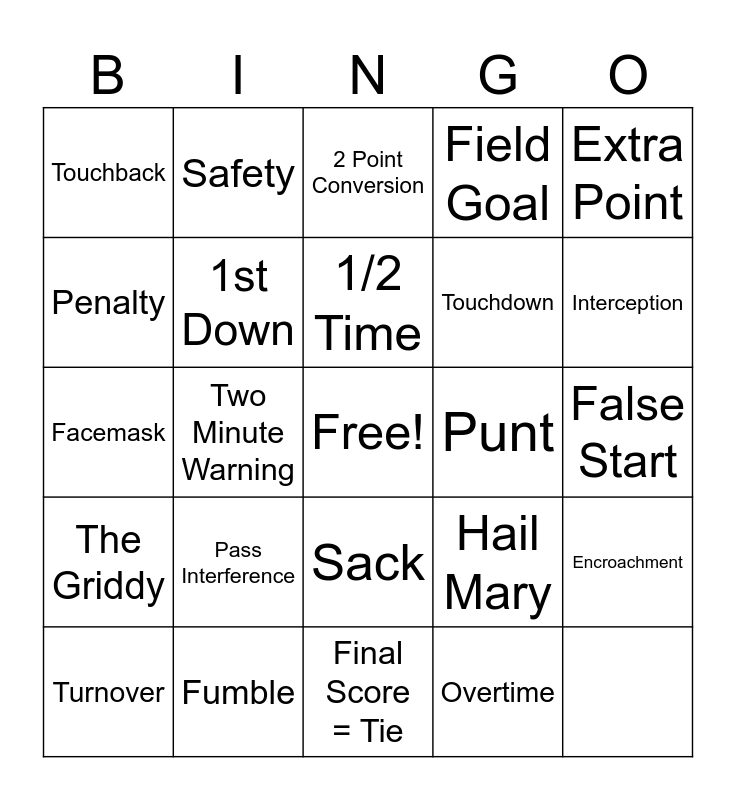 This bingo card has a free space and 24 words: The Griddy, Fumble, Sack, Hail Mary, Extra Point, Touchback, Safety, 2 Point Conversion, Touchdown, Encroachment, Penalty, 1st Down, 2nd Down, Punt, Interception, Turnover, Two Minute Warning, 1/2 Time, Field Goal, False Start, Facemask, Pass Interference, Final Score = Tie and Overtime.