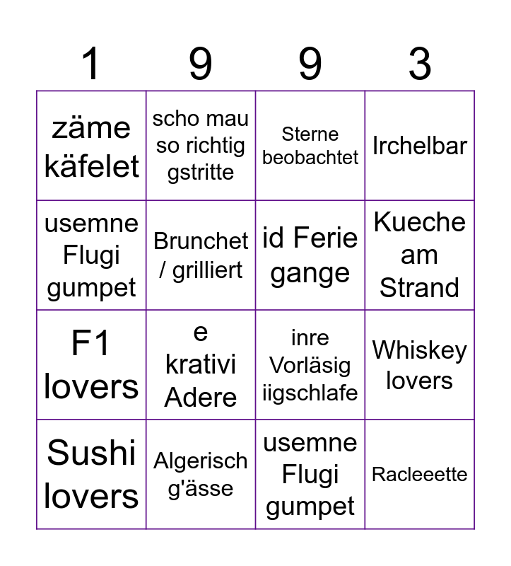 This bingo card has 22 words: Algerisch g'ässe, kenne üs scho +7 Jahr, scho mau so richtig gstritte, go böötle, Brunchet / grilliert, id Ferie gange, zäme käfelet, Sterne beobachtet, inre Vorläsig iigschlafe, Racleeette, F1 lovers, Irchelbar, Sleepover / zältlet, Kueche am Strand, usemne Flugi gumpet, e kreativi Adere, Whiskey lovers, Sushi lovers, e krativi Adere, usemne Flugi gumpet, Kueche am Strand and Sport gmacht.