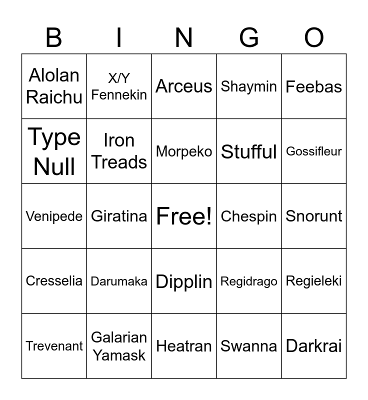 This bingo card has a free space and 24 words: Darumaka, Galarian Yamask, Morpeko, Trevenant, Feebas, Alolan Raichu, Type Null, X/Y Fennekin, Chespin, Dipplin, Stufful, Venipede, Regidrago, Regieleki, Iron Treads, Swanna, Snorunt, Arceus, Gossifleur, Giratina, Darkrai, Cresselia, Shaymin and Heatran.