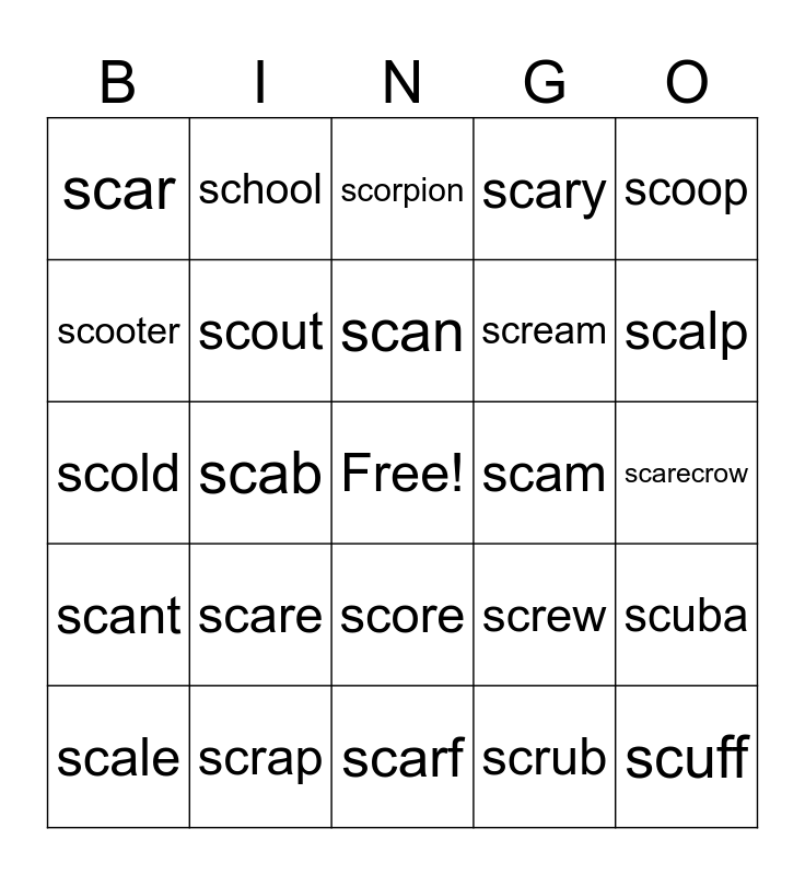 This bingo card has a free space and 25 words: scare, scarf, scan, scale, scoop, scar, scooter, school, scam, score, scream, scold, screw, scuba, scout, scone, scarecrow, scorpion, scalp, scab, scuff, scrap, scant, scary and scrub.