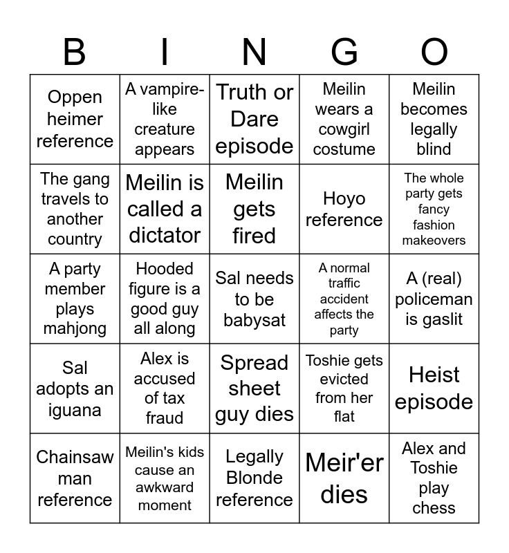 This bingo card has a free space and 24 words: Alex is accused of tax fraud, Meilin's kids cause an awkward moment, Meilin gets fired, Chainsaw man reference, Meilin becomes legally blind, Oppen heimer reference, The gang travels to another country, A vampire-like creature appears, A normal traffic accident affects the party, Spread sheet guy dies, Hoyo reference, A party member plays mahjong, Toshie gets evicted from her flat, Heist episode, Meilin is called a dictator, Meir'er dies, A (real) policeman is gaslit, Truth or Dare episode, The whole party gets fancy fashion makeovers, Hooded figure is a good guy all along, Alex and Toshie play chess, Sal adopts an iguana, Meilin wears a cowgirl costume and Legally Blonde reference.