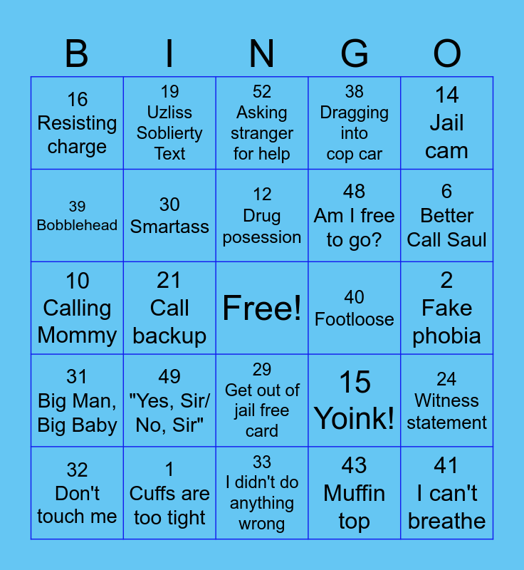 This bingo card has a free space and 24 words: 49 "Yes, Sir/ No, Sir", 1 Cuffs are too tight, 12 Drug posession, 32 Don't touch me, 14 Jail cam, 16 Resisting charge, 39 Bobblehead, 19 Uzliss Soblierty Text, 40 Footloose, 29 Get out of jail free card, 48 Am I free to go?, 10 Calling Mommy, 15 Yoink!, 24 Witness statement, 30 Smartass, 43 Muffin top, 2 Fake phobia, 52 Asking stranger for help, 6 Better Call Saul, 21 Call backup, 41 I can't breathe, 31 Big Man, Big Baby, 38 Dragging into cop car and 33 I didn't do anything wrong.
