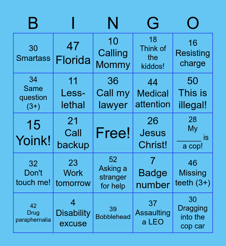 This bingo card has a free space and 24 words: 23 Work tomorrow, 4 Disability excuse, 36 Call my lawyer, 42 Drug paraphernalia, 16 Resisting charge, 30 Smartass, 34 Same question (3+), 47 Florida, 26 Jesus Christ!, 52 Asking a stranger for help, 44 Medical attention, 15 Yoink!, 7 Badge number, 46 Missing teeth (3+), 11 Less-lethal, 37 Assaulting a LEO, 28 My ______ is a cop!, 10 Calling Mommy, 50 This is illegal!, 21 Call backup, 30 Dragging into the cop car, 32 Don't touch me!, 18 Think of the kiddos! and 39 Bobblehead.