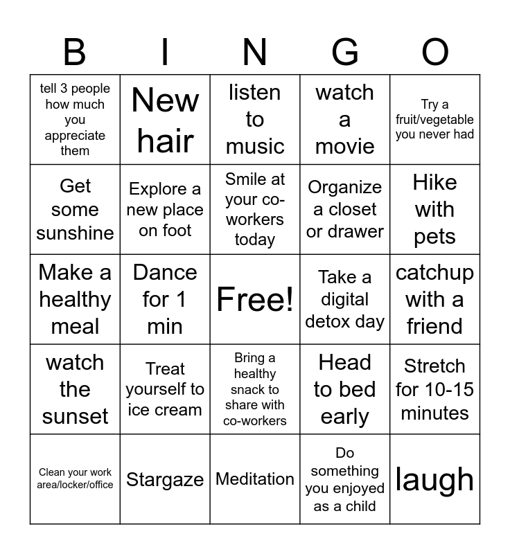 This bingo card has a free space and 24 words: Treat yourself to ice cream, Stargaze, Smile at your co-workers today, Clean your work area/locker/office, Try a fruit/vegetable you never had, tell 3 people how much you appreciate them, Get some sunshine, New hair, Take a digital detox day, Bring a healthy snack to share with co-workers, Organize a closet or drawer, Make a healthy meal, Head to bed early, Stretch for 10-15 minutes, Explore a new place on foot, Do something you enjoyed as a child, catchup with a friend, listen to music, Hike with pets, Dance for 1 min, laugh, watch the sunset, watch a movie and Meditation.