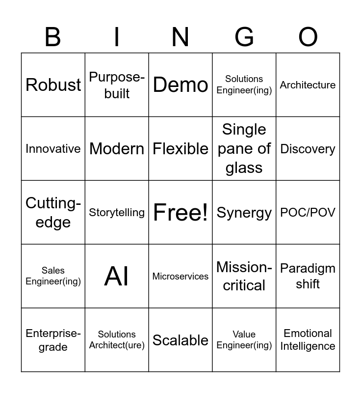 This bingo card has a free space and 25 words: AI, Scalable, Flexible, Enterprise-grade, Architecture, Robust, Innovative, Purpose-built, Synergy, Microservices, Single pane of glass, Cutting-edge, Mission-critical, Paradigm shift, Modern, API, POC/POV, Demo, Discovery, Storytelling, Emotional Intelligence, Solutions Architect(ure), Sales Engineer(ing), Solutions Engineer(ing) and Value Engineer(ing).