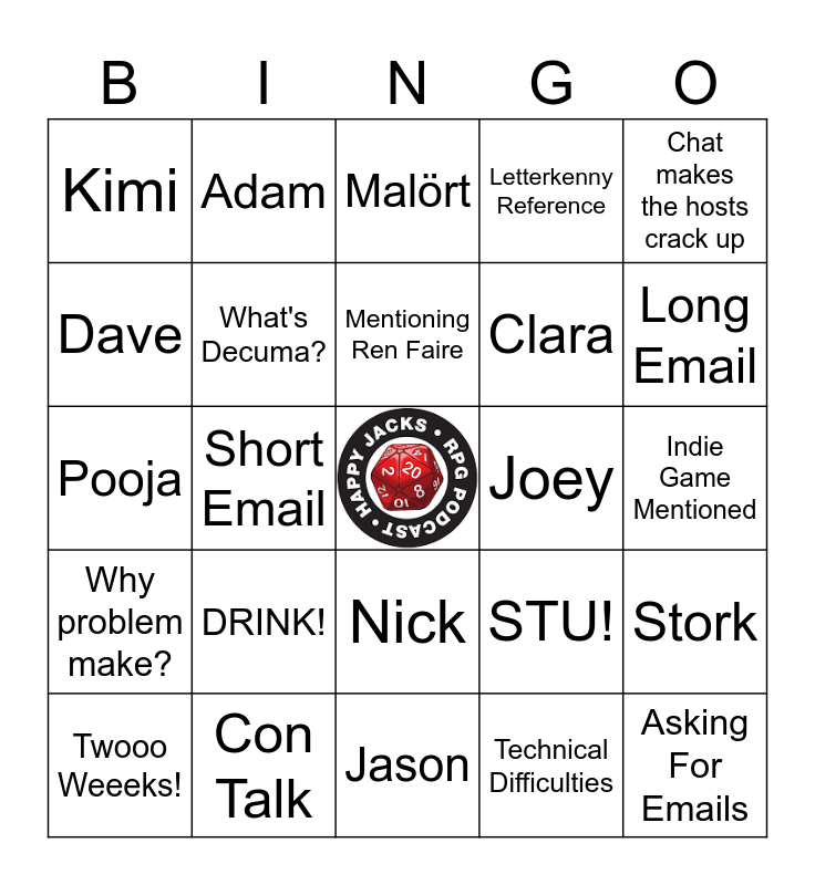 This bingo card has a free space and 24 words: DRINK!, Con Talk, Mentioning Ren Faire, Twooo Weeeks!, Chat makes the hosts crack up, Kimi, Dave, Adam, Joey, Nick, Clara, Pooja, STU!, Stork, What's Decuma?, Technical Difficulties, Indie Game Mentioned, Malört, Long Email, Short Email, Asking For Emails, Why problem make?, Letterkenny Reference and Jason.