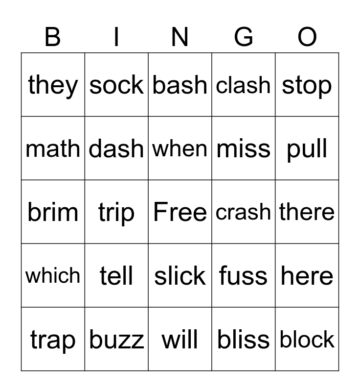 This bingo card has a free space and 24 words: tell, buzz, when, trap, stop, they, math, sock, crash, slick, miss, brim, fuss, here, dash, bliss, there, bash, pull, trip, block, which, clash and will.