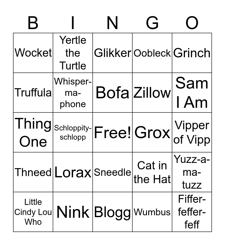 This bingo card has a free space and 24 words: Lorax, Nink, Bofa, Little Cindy Lou Who, Grinch, Wocket, Truffula, Yertle the Turtle, Grox, Sneedle, Zillow, Thing One, Cat in the Hat, Yuzz-a-ma-tuzz, Whisper-ma-phone, Wumbus, Vipper of Vipp, Glikker, Sam I Am, Schloppity-schlopp, Fiffer-feffer-feff, Thneed, Oobleck and Blogg.