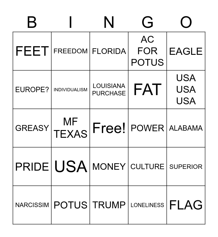This bingo card has a free space and 24 words: USA, POTUS, LOUISIANA PURCHASE, NARCISSIM, EAGLE, FEET, EUROPE?, FREEDOM, POWER, MONEY, FAT, GREASY, CULTURE, SUPERIOR, INDIVIDUALISM, LONELINESS, ALABAMA, FLORIDA, USA USA USA, MF TEXAS, FLAG, PRIDE, AC FOR POTUS and TRUMP.