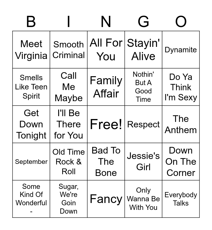 This bingo card has a free space and 33 words: My Maria, Straight Up, I'll Be There for You, Somebody's Watching Me, September, Call Me Maybe, Dynamite, Some Kind Of Wonderful -, Smooth Criminal, Don't Stop Believin', Family Affair, All For You, I Love Rock 'N Roll, Life is a Highway, Respect, Do Ya Think I'm Sexy, Sugar, We're Goin Down, Get Down Tonight, Old Time Rock & Roll, Jessie's Girl, Bad To The Bone, Jump, Meet Virginia, The Anthem, Fancy, Everybody Talks, Stayin' Alive, Nothin' But A Good Time, Smells Like Teen Spirit, Down On The Corner, Walkin ' On The Sun, Only Wanna Be With You and Breakfast At Tiffany’s.