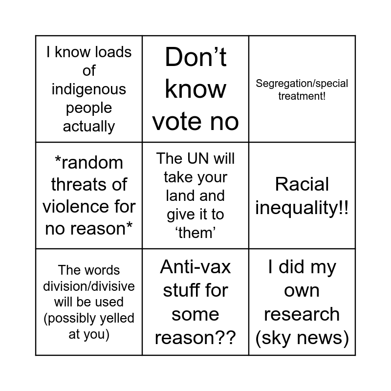 This bingo card has a free space and 8 words: Racial inequality!!, Segregation/special treatment!, Don’t know vote no, The words division/divisive will be used (possibly yelled at you), I know loads of indigenous people actually, I did my own research (sky news), *random threats of violence for no reason* and Anti-vax stuff for some reason??.