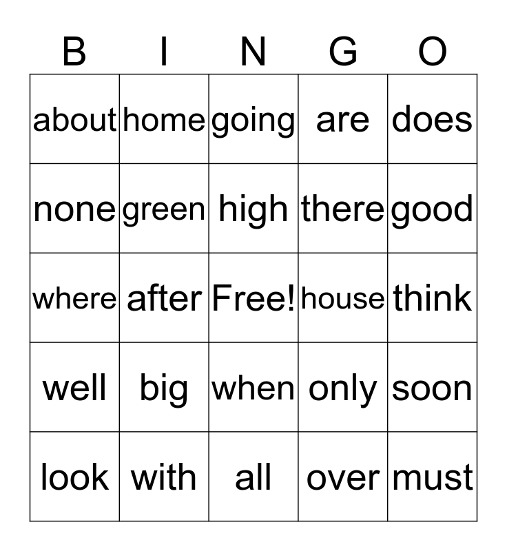 This bingo card has a free space and 24 words: big, with, high, look, does, about, none, home, house, when, there, where, only, soon, green, over, think, going, good, after, must, well, are and all.