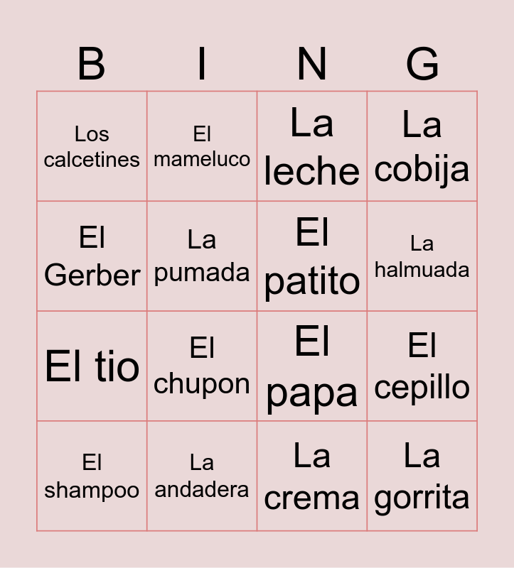 This bingo card has 44 words: Los panales, El shampoo, El portabebe, El moises, La cuna, El babero, La leche, La bebe, El Gerber, La carriola, La cobija, La andadera, Las tuallitas, La siguena, La panalera, La muneca, La banera, El papa, La mama, El chupon, El mameluco, la sonaja, Los zapatitos, Los calcetines, El talco, La crema, Los bloques, La abuela, El abuelo, La gorrita, El osito, La sonaja, El mameluco, Las vacunas, El cepillo, Los guantes, El columpio, El termomerto, La halmuada, La pumada, El tio, La tia, El patito and El vestido.